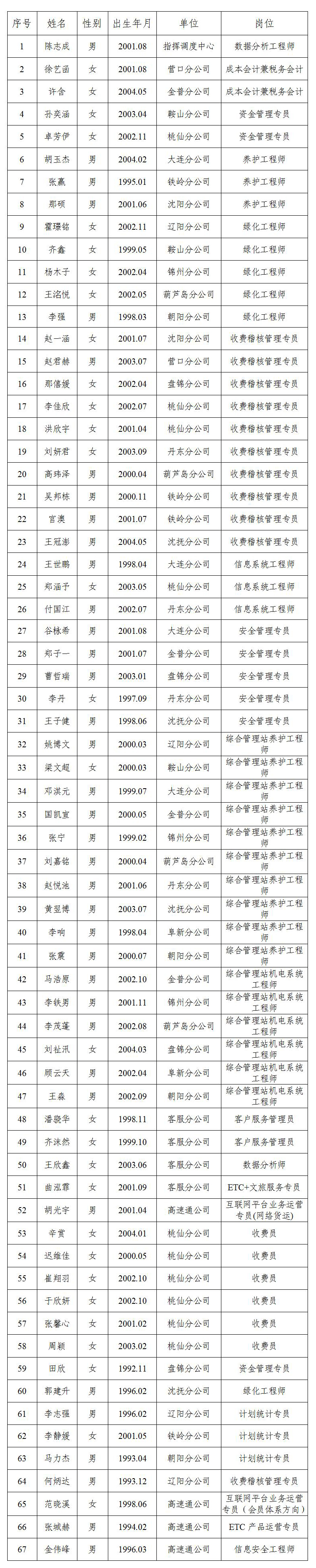 根據(jù)遼寧省高速公路運(yùn)營管理有限責(zé)任公司招聘工作有關(guān)要求,經(jīng)過資格審核、筆試、面試、考察、體檢等程序,確定以下人員為擬聘用人員,現(xiàn)予以公示。公示期間如有問題,請(qǐng)向遼寧省高速公路運(yùn)營管理有限責(zé)任公司致電反映。